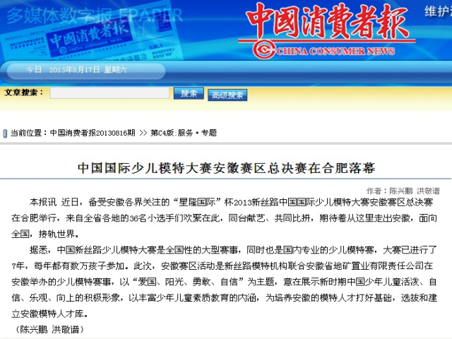 《中國消費(fèi)報(bào)》:中國國際少兒模特大賽安徽賽區(qū)總決賽在合肥落幕