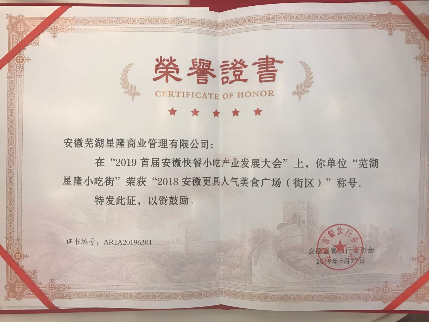 安徽蕪湖星隆商業(yè)管理有限公司喜獲 “2018年度安徽快餐小吃50強(qiáng)企業(yè)”“2018安徽更具人氣美食廣場(chǎng)(街區(qū))”兩項(xiàng)殊榮。這兩項(xiàng)殊榮肯定了蕪湖星隆商管公司在新餐飲的浪潮下,把握契機(jī),勇于創(chuàng)新,打造的“星隆小吃街”這一自有品牌,從誕生至今,用心細(xì)致運(yùn)營(yíng),為安徽小吃產(chǎn)業(yè)發(fā)展做出了貢獻(xiàn),起到了積極的榜樣作用。