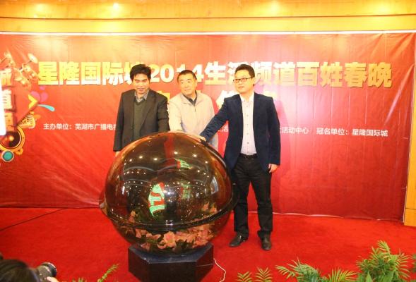 11月19日下午,蕪湖星隆國際城2014蕪湖生活頻道百姓春晚啟動(dòng)儀式暨新聞發(fā)布會(huì)在蕪湖市廣電中心新聞發(fā)布廳舉行。蕪湖市廣播電視臺(tái)紀(jì)委書記高成、安徽省星隆商管公司總經(jīng)理鄒華權(quán)、蕪湖地礦置業(yè)公司總經(jīng)理戴振光共同開啟激光球,標(biāo)志著2014百姓春晚正式啟動(dòng)。
